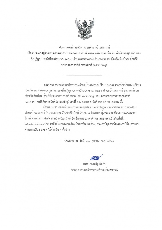 ประกาศผู้ชนะจ้างเหมาเอกชนเก็บขยะและนำมูลฝอยไปกำจัด ในเขตพื้นที่รับผิดชอบ องค์การบริหารส่วนตำบลบ้านสหกรณ์ อำเภอแม่ออน จังหวัดเชียงใหม่ ประจำปี 2569