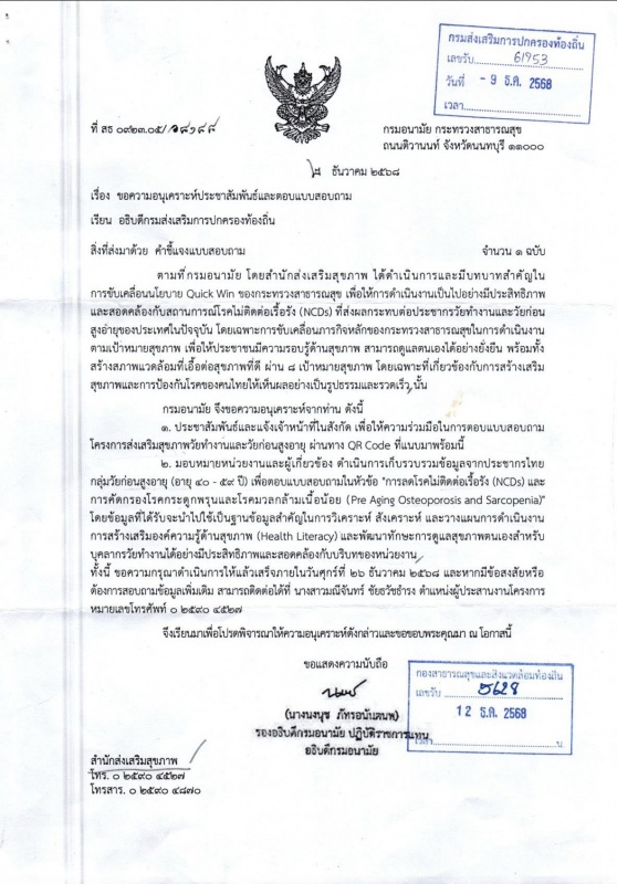 การขับเคลื่อนนโยบาย Quick Win ของกระทรวงสาธารณสุข เพื่อให้การดำเนินงานเป็นไปอย่างมีประสิทธิภาพและสอดคล้องกับสถานการณ์โรคไม่ติดต่อเรื้อรัง (NCDs) ที่ส่งผลกระทบต่อประชากรวัยทำงานและวัยก่อน สูงอายุของประเทศในปัจจุบัน โดยเฉพาะการขับเคลื่อนภารกิจหลักของกระทรวงสาธารณสุขในการดำเนินงานตามเป้าหมายสุขภาพ เพื่อให้ประชาชนมีความรอบรู้ด้านสุขภาพ สามารถดูแลตนเองได้อย่างยั่งยืน พร้อมทั้งสร้างสภาพแวดล้อมที่เอื้อต่อสุขภาพที่ดี ผ่าน๘ เป้าหมายสุขภาพ