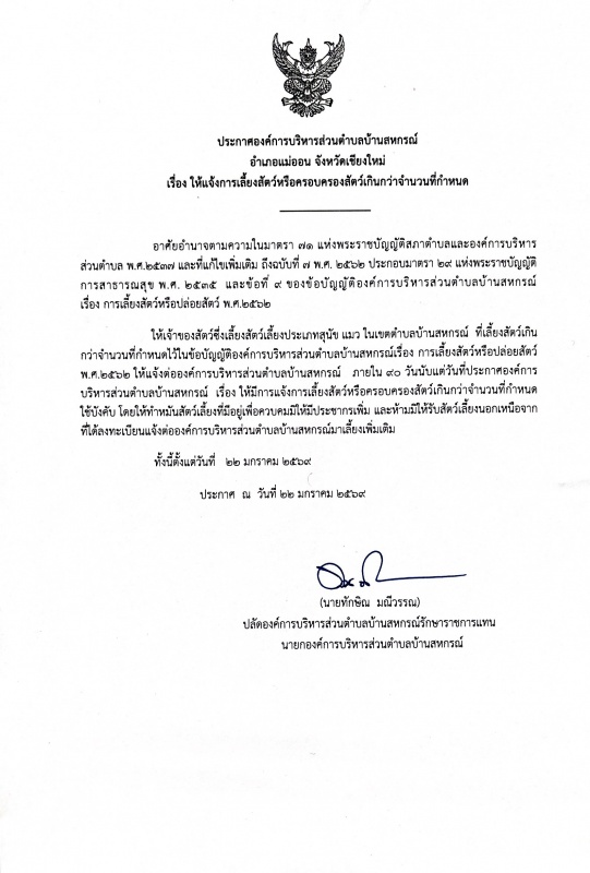 ประกาศองค์การบริหารส่วนตำบลบ้านสหกรณ์ อำเภอแม่ออน จังหวัดเชียงใหม่ เรื่อง ให้แจ้งการเลี้ยงสัตว์หรือครอบครองสัตว์เกินกว่าจำนวนที่กำหนด