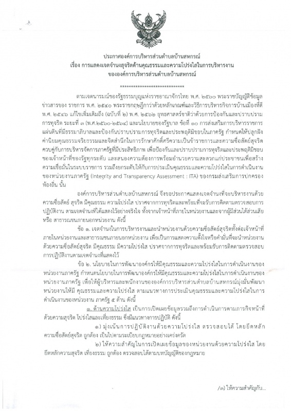 จตจำนงสุจริต เสริมสร้างคุณธรรม และความโปร่งใสในการบริหารราชการปี 2565
