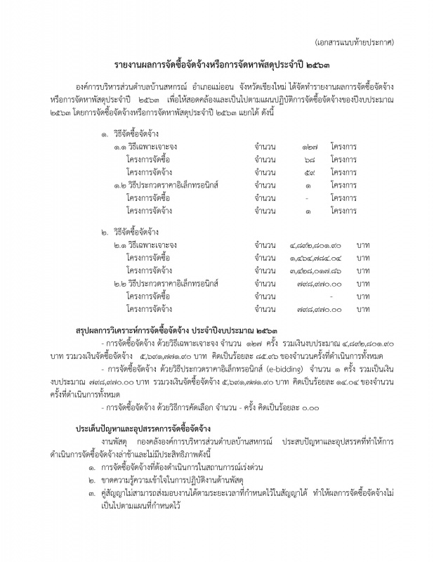 | 1 | รายงานสรุปผลการจัดซื้อจัดจ้างของ [องค์การบริหารส่วนตำบลบ้านสหกร์] ปี 2566 | 155 KB. | 151 |