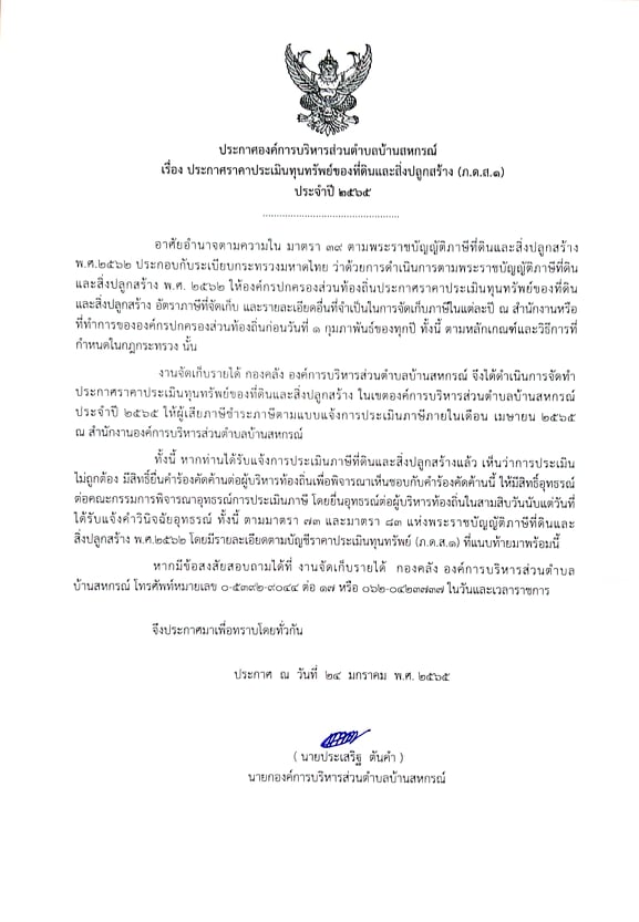 ประกาศราคาประเมินทุนทรัพย์ที่ดินและสิ่งปลูกสร้าง (ภ.ด.ส.1) ประจำปี 2565