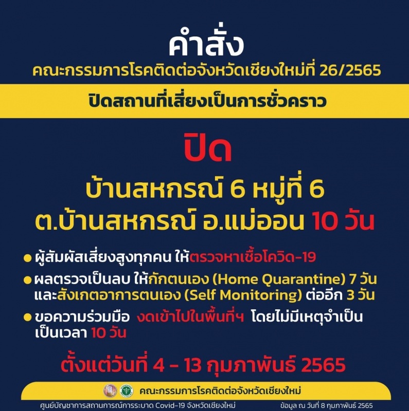 ให้ปิดพื้นที่บ้านสหกรณ์ หมู่ที่ 6 ตำบลบ้านสหกรณ์ เป็นระยะเวลา 10 วัน (ตั้งแต่วันที่ 4 - 13 กุมภาพันธ์ 2565)