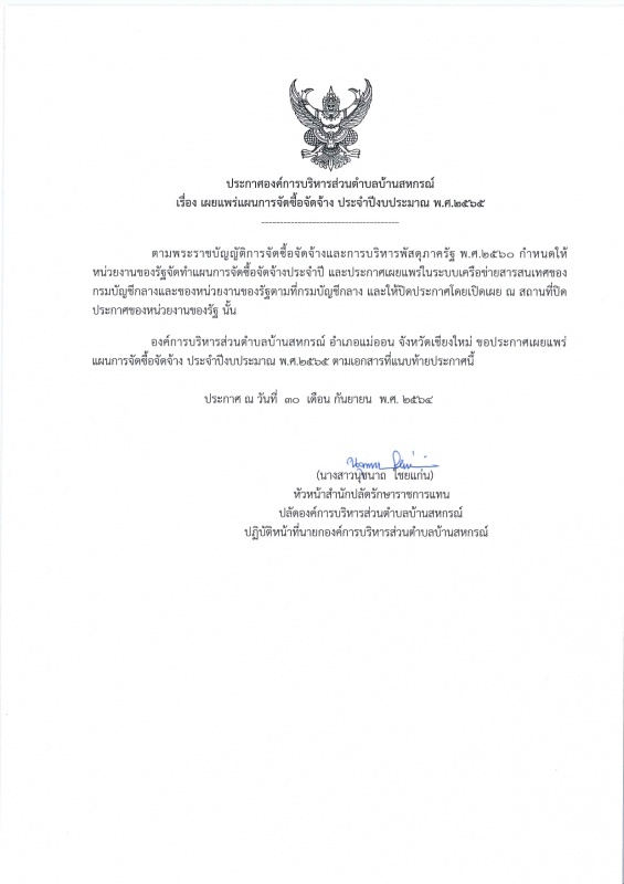 ประกาศแผนการจัดซื้อจัดจ้าง ประจำปีงบประมาณ 2565