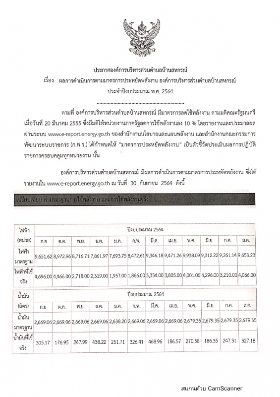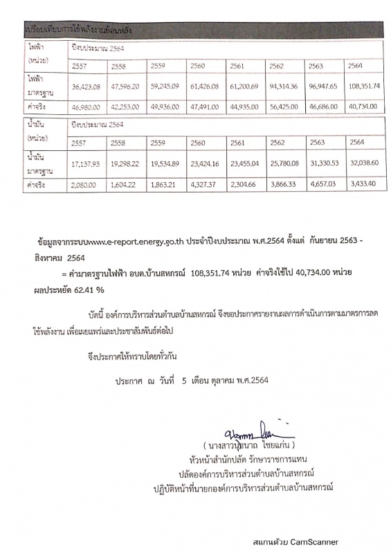 ประกาศ อบต.บ้านสหกรณ์ เรื่อง ผลการดำเนินการตามมาตรการประหยัดพลังงาน องค์การบริหารส่วนตำบลบ้านสหกรณ์ ประจำปีงบประมาณ พ.ศ.2564