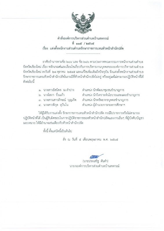 คำสั่งแต่งตั้งผู้รักษาราชการแทนหัวหน้าสำนักปลัด