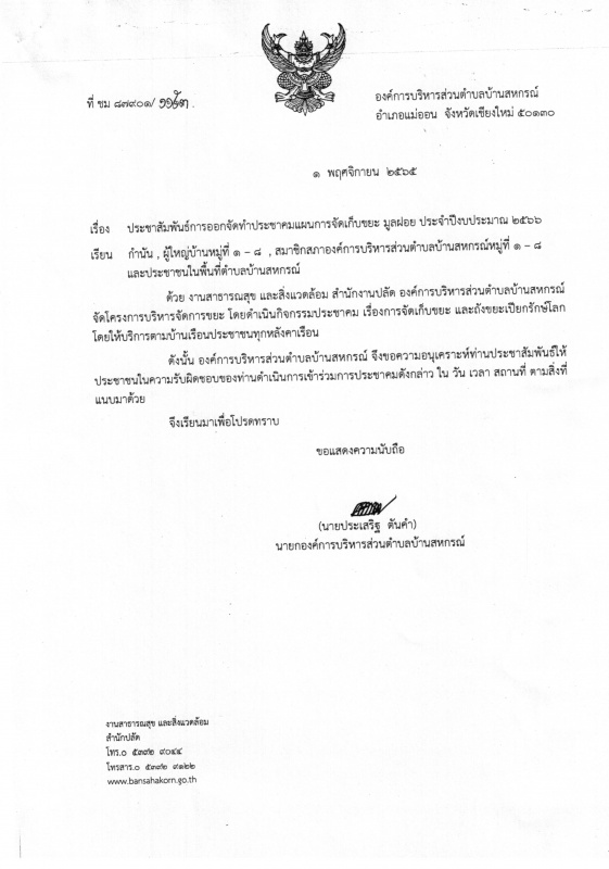 | 1 | ประชาสัมพันธ์การออกจัดทำประชาคมแผนการจัดเก็บขยะ มูลฝอย ปะจำปีงบประมาณ 2566 | 1.03 MB. | 164 |