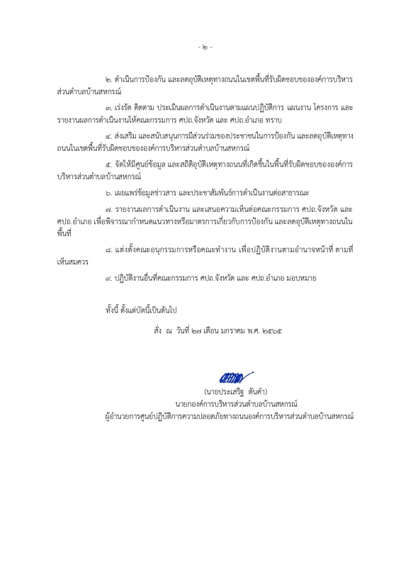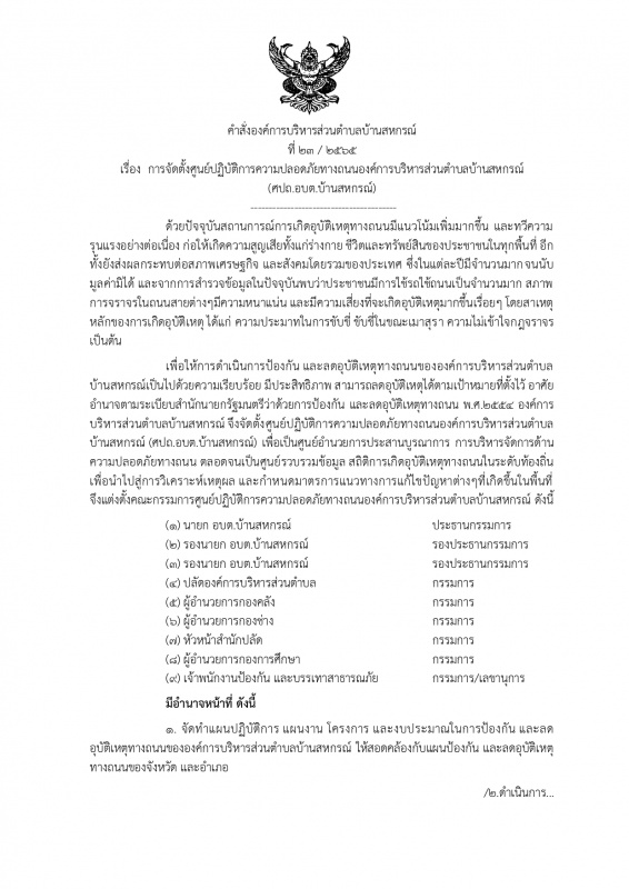 เรื่อง การจัดตั้งศูนย์ปฏิบัติการความปลอดภัยทางถนนองค์การบริหารส่วนตำบลบ้านสหกรณ์ (ศปถ.อบต.บ้านสหกรณ์)