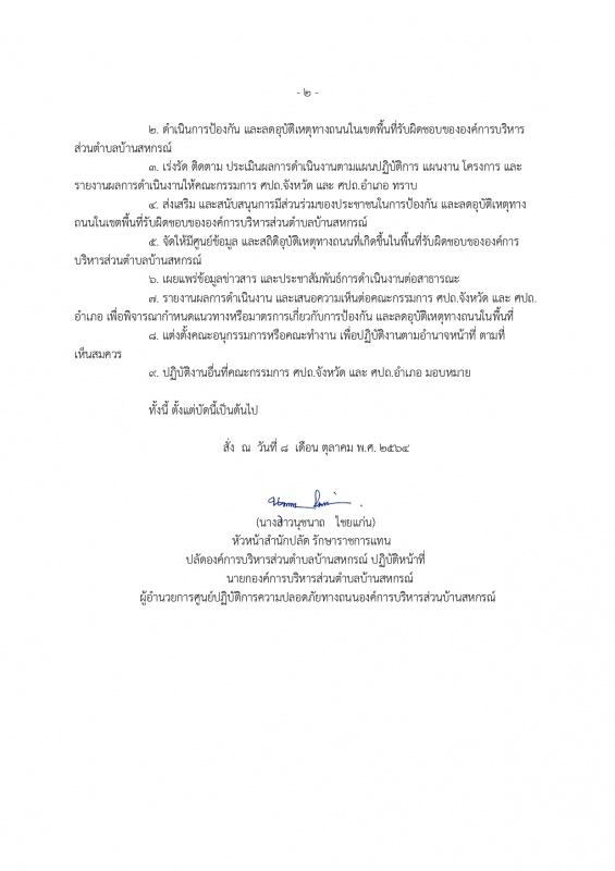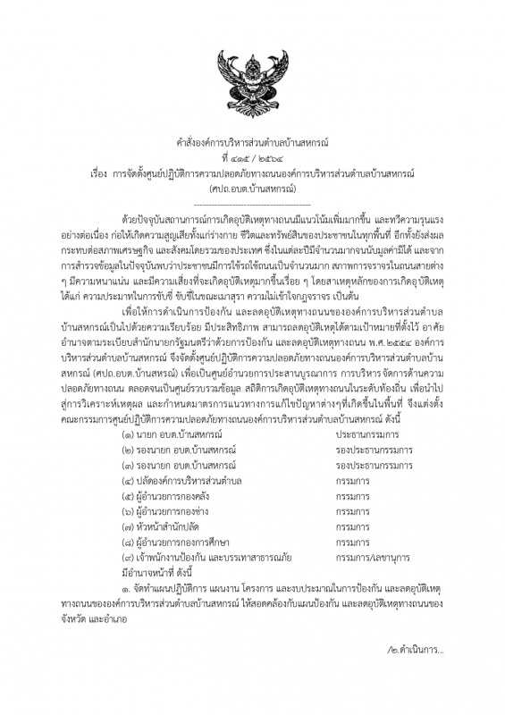 เรื่อง การจัดตั้งศูนย์ปฏิบัติการความปลอดภัยทางถนนองค์การบริหารส่วนตำบลบ้านสหกรณ์ (ศปถ.อบต.บ้านสหกรณ์) ปี 2564