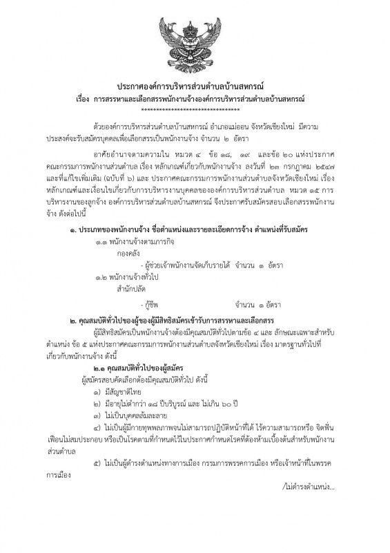 ประกาศองค์การบริหารส่วนตำบลบ้านสหกรณ์ เรื่อง การสรรหาและเลือกสรรพนักงานจ้างองค์การบริหารส่วนตำลบ้านสหกรณ์