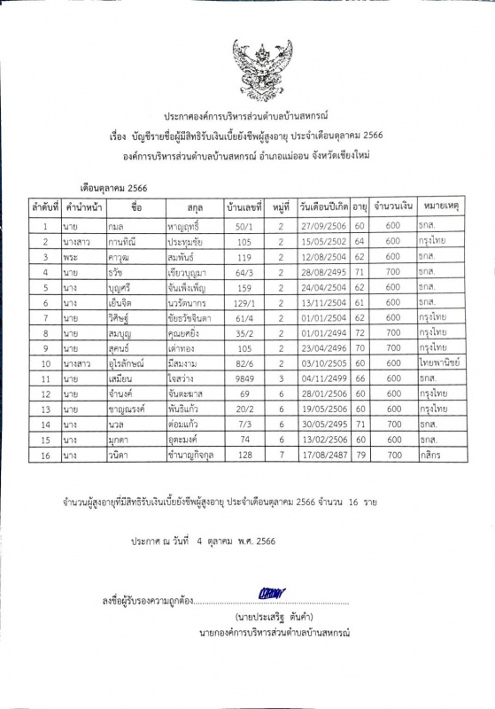 ประกาศองค์การบริหารส่วนตำบลบ้านสหกณ์ เรื่อง บัญชีรายผู้มีสิทธิรับเงินเบี้ยยังชีพผู้สูงอายุ ประจำเดือนตุลาคม 2566