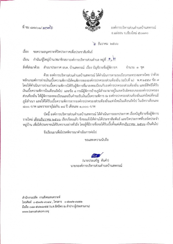 ประชาสัมพันธ์ ผู้สูงอายุและผู้พิการรายใหม่ เดือน ธันวาคม 2566 และหนังสือประชาสัมพันธ์จ่ายเบี้ยยังชีพ เดือน ธันวาคม 2566 กำหนดจ่ายในวัน ศุกร์ ที่ 8 ธันวาคม 2566
