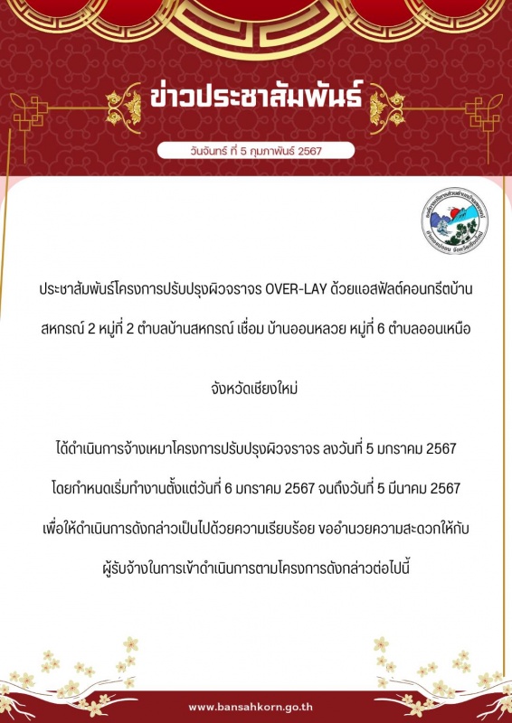 ประชาสัมพันธ์โครงการปรับปรุงผิวจราจร Over-lay ด้วยเเอสฟัลต์คอนกรีตบ้าน