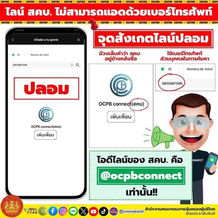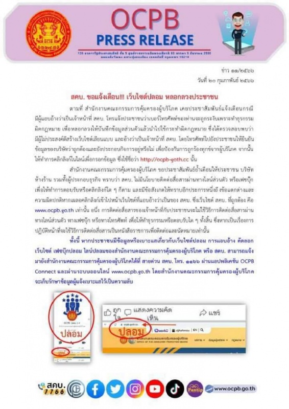 สคบ.ไม่มีนโยบายติดต่อสื่อสารผ่านทางไลน์ส่วนตัวหรือเฟซบุ๊ก เพื่อให้ทำการตอบรับหรือคลิกลิงค์ใดๆ ซึ่งหากเป็นเรื่องการปฏิบัติหน้าที่จะใช้วิธีการติดต่อสื่อสารเป็นหนังสือราชการเพื่อติดต่อและนัดหมายเท่านั้น