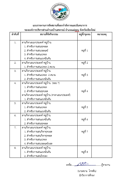 ตามที่องค์การบริหารส่วนตำบล มีหน้าที่ส่งเสริมสุขภาพ พลานามัยของคนในตำบล ประกอบกับนโยบายของผู้บริหาร ในการที่จะส่งเสริมสุขภาพพลานามัยของคนในชุมชน จึงได้ให้กองการศึกษา องค์การบริหารส่วนตำบลบ้านสหกรณ์ ได้เข้าไปบำรุงรักษา ซ่อมแซมให้ลานกีฬามีความพร้อมต่อการเล่นกีฬาออกกำลังกายของประชาชน ครบทั้ง 8 หมู่บ้าน
