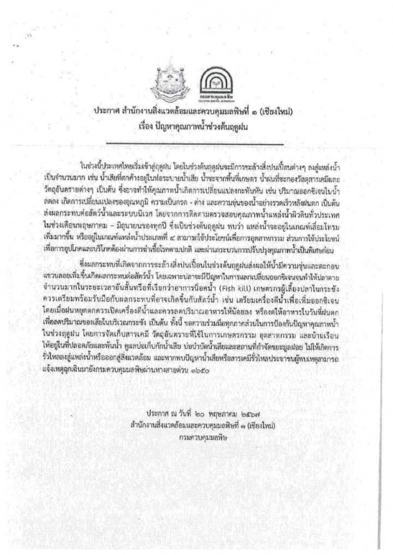 ประกาศสำนักงานสิ่งเเวดล้อมเเละควบคุมมลพิษที่ 1 เชียงใหม่