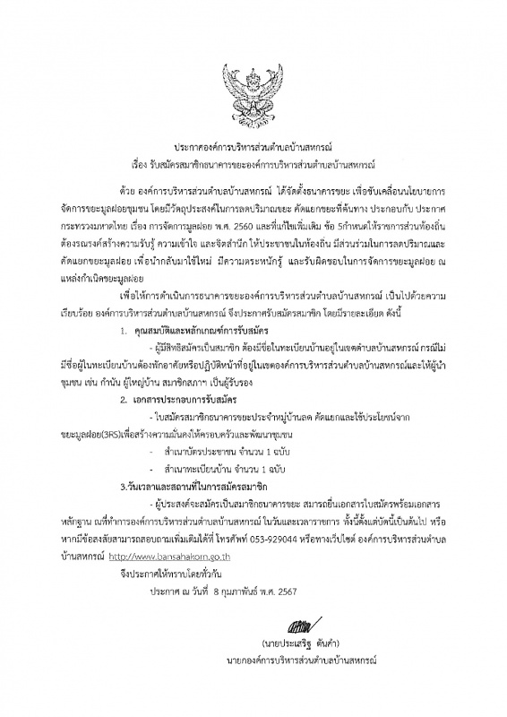ประชาสัมพันธ์การรับสมัครสมาชิกธนาคารขยะ