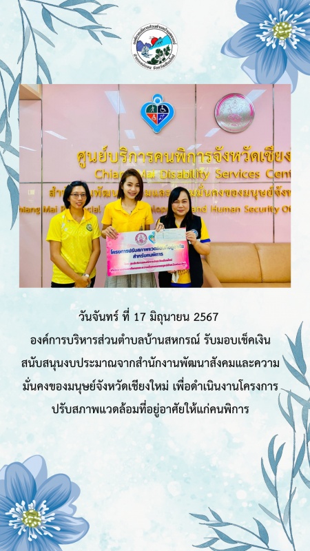 วันจันทร์ ที่ 17 มิถุนายน 2567 กองสวัสดิการสังคม องค์การบริหารส่วนตำบลบ้านสหกรณ์ รับมอบเช็คเงินสนับสนุนงบประมาณจากสำนักงานพัฒนาสังคมและความมั่นคงของมนุษย์จังหวัดเชียงใหม่ เพื่อดำเนินงานโครงการปรับสภาพแวดล้อมที่อยู่อาศัยให้แก่คนพิการ