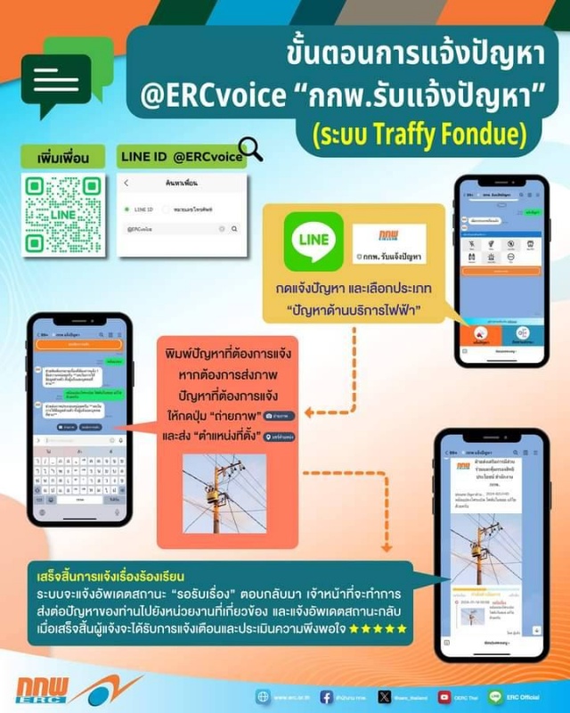 สำนักงานคณะกรรมการกำกับกิจการพลังงาน ประจำเขต 1 (เชียงใหม่) ว่า พระราชบัญญัติประกอบกิจการพลังงาน พ.ศ.2550 หมวด 6 การคุ้มครองผู้ใช้พลังงานกำหนดให้คณะกรรมการกำกับกิจการพลังงาน (กกพ.) มีหน้าที่กำกับดูแลผู้รับใบอนุญาตต้องจัดให้มีการให้บริการพลังงานเป็นไปตามมาตรฐานคุณภาพการให้บริการและตามแบบมาตรฐานของสัญญาเกี่ยวกับการให้บริการ กกพ. จึงพัฒนาช่องทางการรับเรื่องร้องเรียนร้องปัญหาการให้บริการไฟฟ้าสำหรับประชาชน ผ่าน Line Official หรือ Line ID @ERCvoece (ระบบ Traffy Fondue) เพื่อเพิ่มช่องทางในการติดต่อสื่อสารรับเรื่องร้องเรียนจากประชาชน