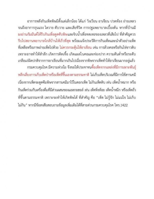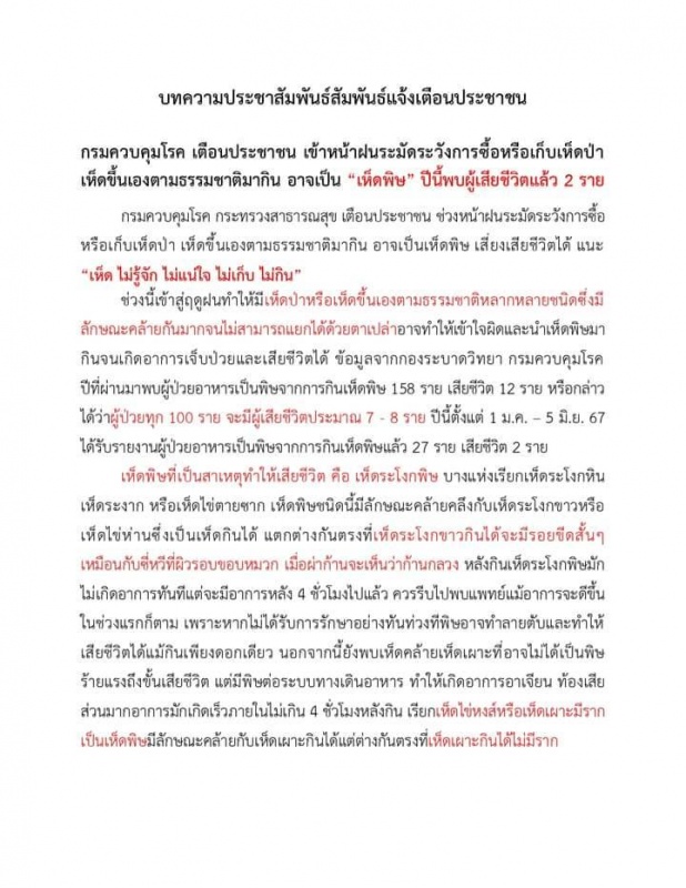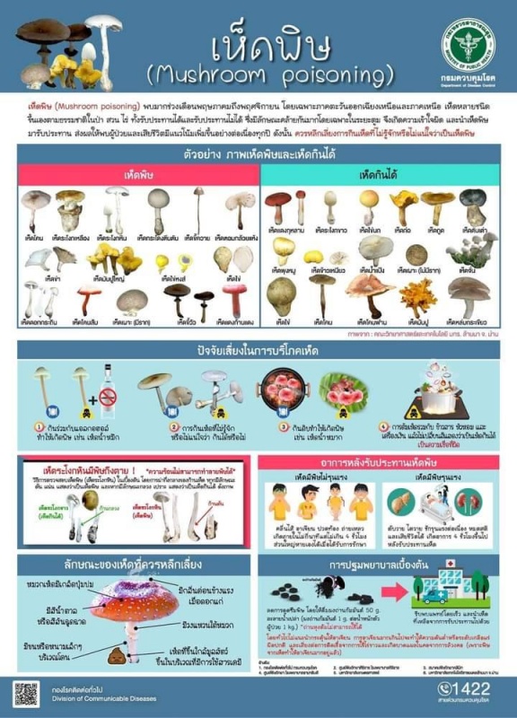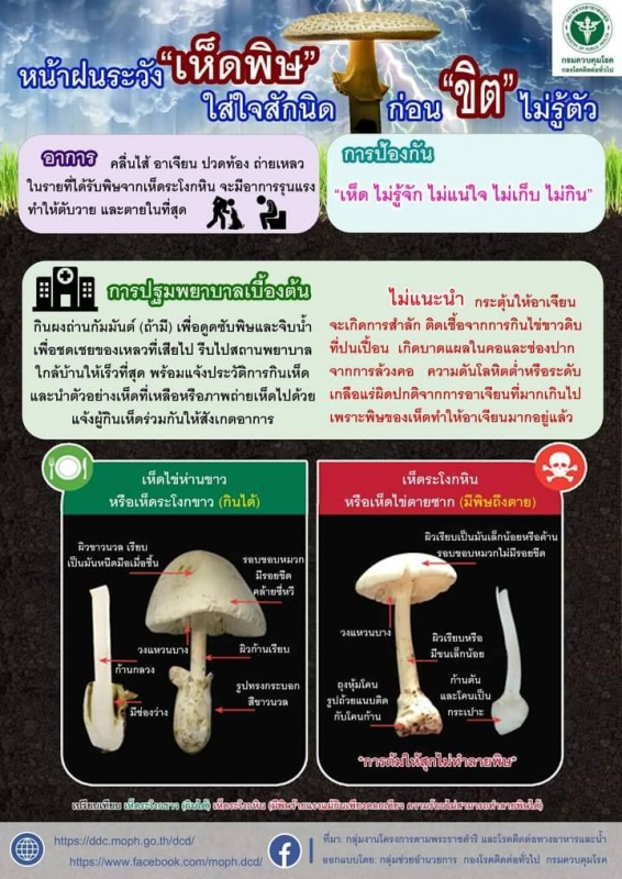 เนื่องจากกรมควบคุมโรค เตือนประชาชน เข้าหน้าฝน อากาศจะมีความเย็นชื้นทำให้เหมาะสมต่อการเจริญเติบโตของเห็ดป่าหลายชนิด ขอให้ประชาชนระมัดระวังการซื้อหรือเก็บเห็ดป่า เห็ดขึ้นเองตามธรรมชาติมากิน อาจเป็น "เห็ดพิษ" เสี่ยงเสียชีวิตได้ จึงเเจ้งเตือนให้ประชาชนทุกท่านระมัดระวังการซื้อหรือเก็บเห็ดป่า เห็ดขึ้นเองตามธรรมชาติมากิน เพราะอาจเป็น "เห็ดพิษ" ได้
