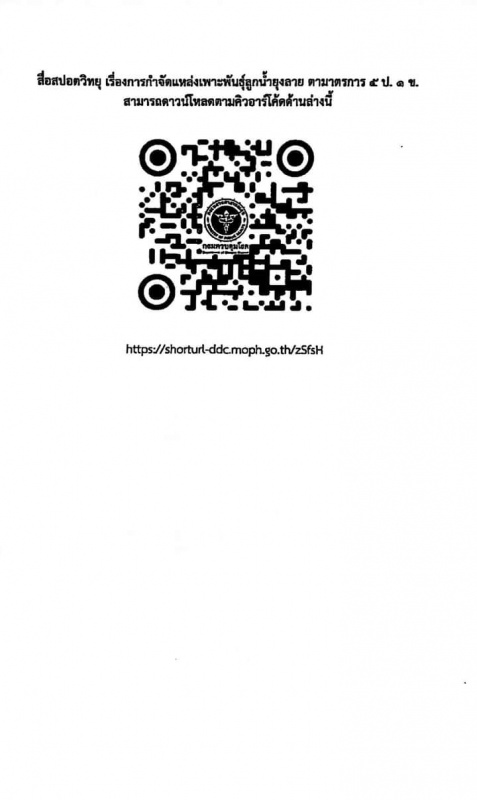 สื่อสปอตวิทยุ เรื่องการกำจัดแหล่งเพาะพันธุ์ลูกน้ำยุงลาย ตามมาตรการ 5 ป.1 ข. สามารถดาวน์โหลดตามคิวอาร์โค้ดด้านล่างนี้