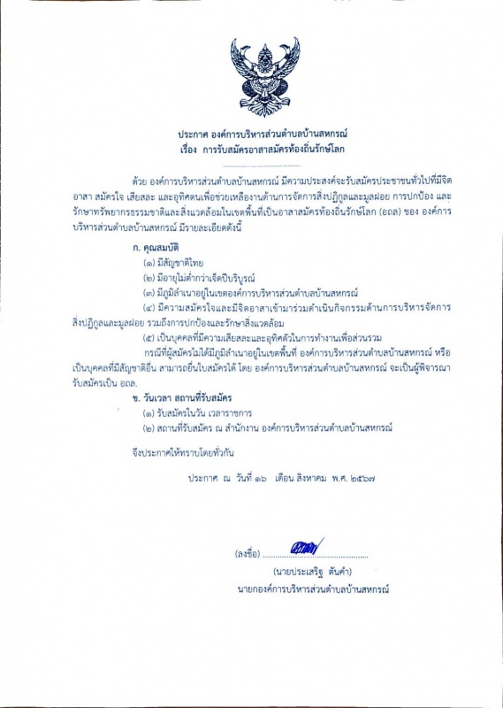ประกาศการรับสมัครอาสาสมัครท้องถิ่นรักษ์โลก (อถล.) เพิ่มเติม