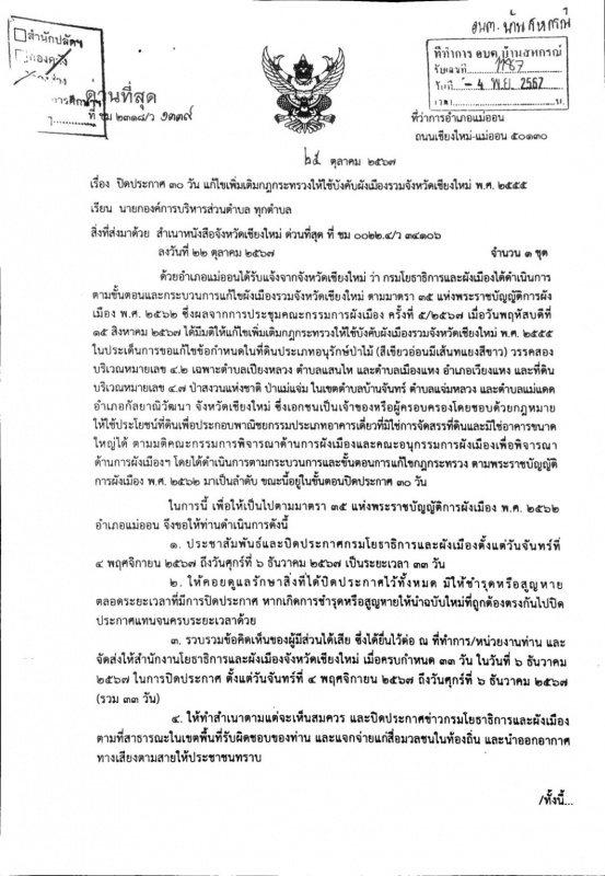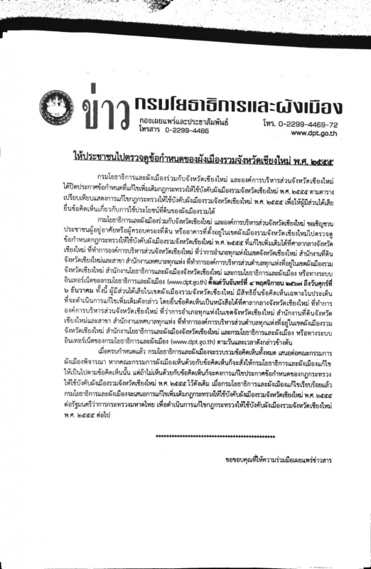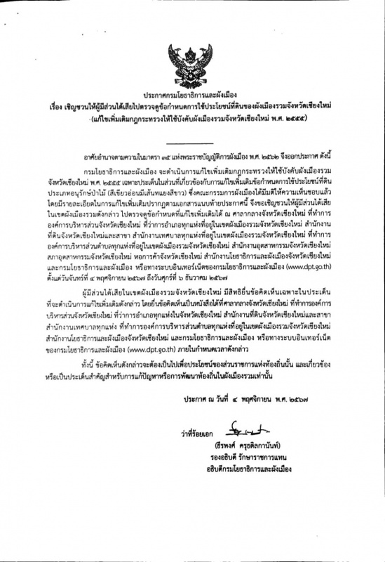 ประชาสัมพันธ์ เรื่อง ปิดประการศ 30 วัน แก้ไข้เพิ่มเติมกฏกระทรวงให้ใช้บังคับผังเมืองรวมจังหวัดเชียงใหม่ พ.ศ.2555