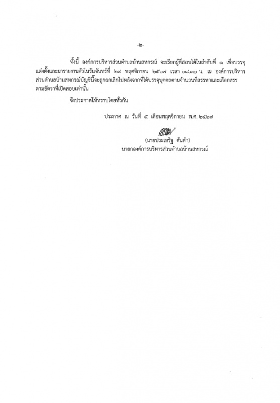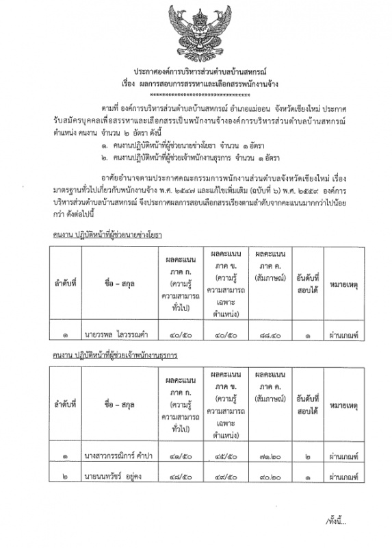 ประกาศองค์การบริหารส่วนตำบลบ้านสหกรณ์ เรื่อง ผลการสรรหาและเลือกสรรพนักงานจ้าง ฯ