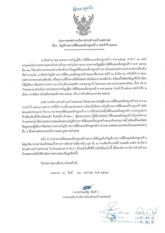 ประกาศองค์การบริหารส่วนตำบลบ้านสหกรณ์ เรือง บัญชีรายการที่ดินและสิ่งปลูกสร้าง ประจำปี 2567