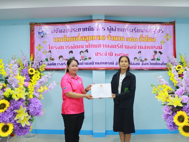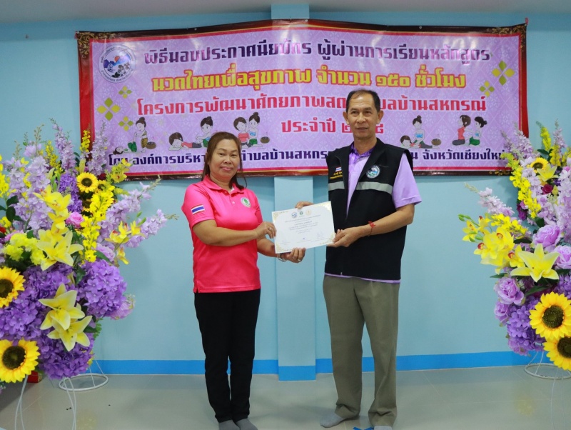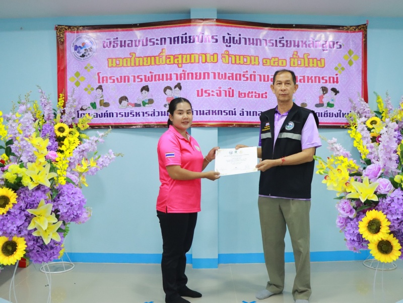 วันพฤหัสบดี ที่ 6 มีนาคม 2568 นาย ประเสริฐ ตันคำ นายกองค์บริหารส่วนตำบลบ้านสหกรณ์ เปิดประธานเปิดพิธี โครงการพัฒนาศักยภาพสตรีตำบลบ้านสหกรณ์ และมอบ ประกาศนียบัตร แก่ผู้ผ่านการเรียนหลักสูตร นวดเพื่อสุขภาพ จำนวน14ท่าน