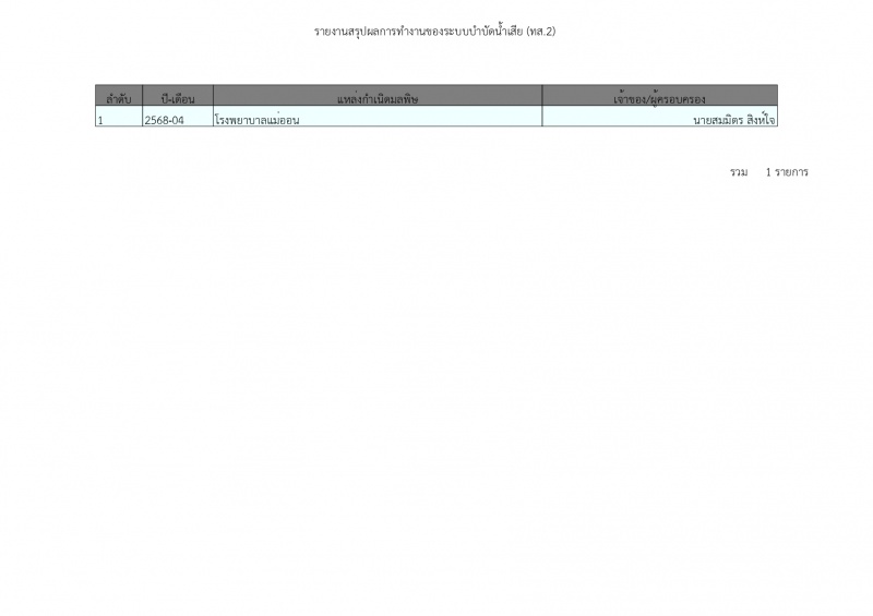 แบบ รายงานสรุปผลการทำงานของระบบ บำบัดน้ำเสีย ประจำปีงบประมาณ 2567
