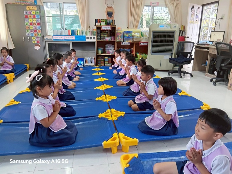 ตามคำสอนพระพุทธศาสนา ประจำดือนกรกฎาคม 2568 เช่น กิจกรรมหน้าเสาธง กิจกรรมไหว้พระสวดมนต์หน้าเสาธง การไหว้ การไหว้ขอบคุณผู้ใหญ่ กิจกรรมกล่าวขอบคุณอาหาร เดินอย่างเป็นระเบียบ การฝึกทำสมาธิ การเดินจงกลม การไหว้ การกราบ