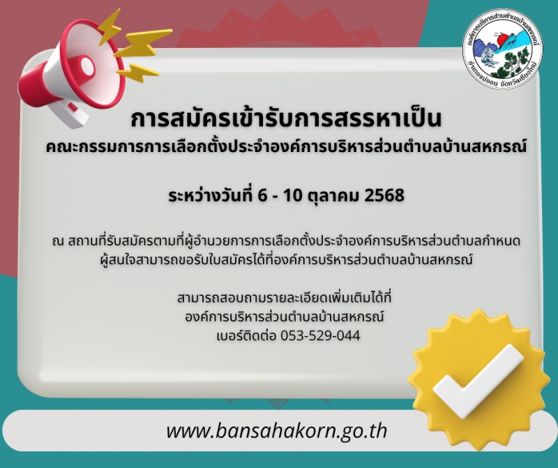 ประกาศผู้อำนวยการการเลือกตั้งประจำองค์การบริหารส่วนตำบลบ้านสหกรณ์ เรื่อง การรับสมัครบุคคลเข้ารับการสรรหาเป็นคณะกรรมการการเลือกตั้ง ประจำองค์การบริหารส่วนตำบลบ้านสหกรณ์ ปี 2568