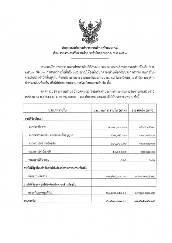 ประกาศองค์การบริหารส่วนตำบลบ้านสหกรณ์ เรื่องรายงานการรับจ่ายเงินประจำปีงบประมาณ พ.ศ.2568