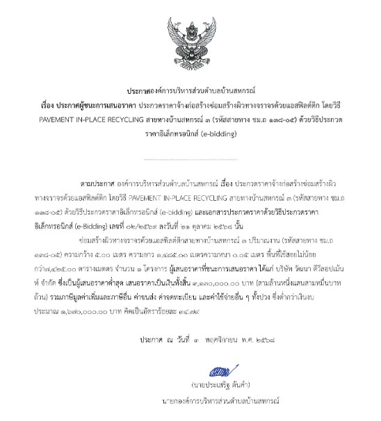 ประกาศผู้ชนะการเสนอราคาจ้างก่อสร้างซ่อมสร้างผิวทางจราจรด้วยแอสฟิลต์ติก โดยวิธี PAVEMENT IN-PLACE RECYCLING สายทางบ้านสหกรณ์ 3 (รหัสสายทาง ชม.ถ 138-05)