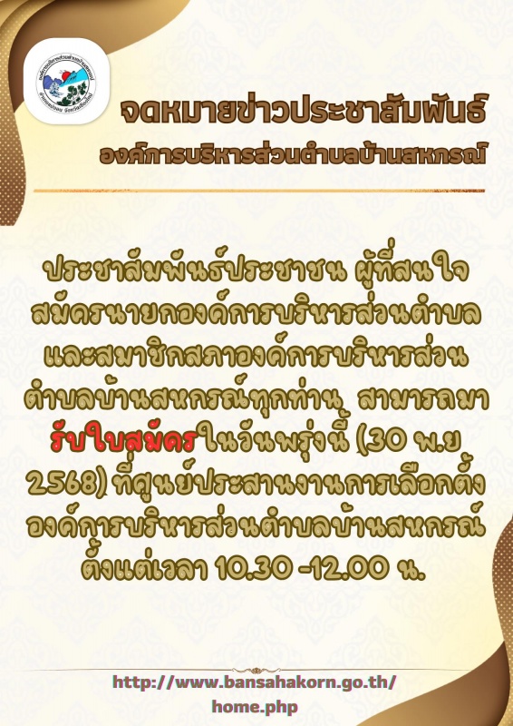 ประชาสัมพันธ์ประชาชน ผู้ที่สนใจสมัครนายกองค์การบริหารส่วนตำบลและสมาชิกสภาองค์การบริหารส่วนตำบลบ้านสหกรณ์ทุกท่าน สามารถมารับใบสมัครในวันพรุ่งนี้ (30 พย 2568)ที่ศูนย์ประสานงานการเลือกตั้งองค์การบริหารส่วนตำบลบ้านสหกรณ์ตั้งแต่เวลา 10.30 -12.00 น.