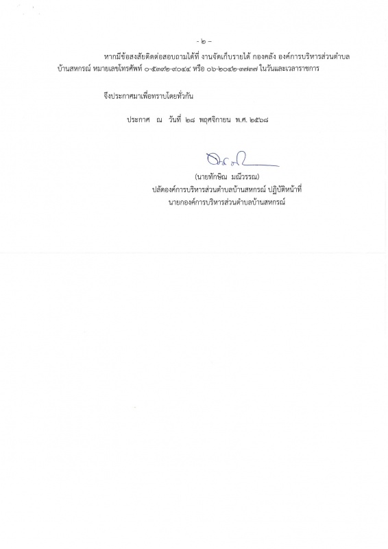 ประกาศองค์การบริหารส่วนตำบลบ้านสหกรณ์ เรื่องการขยายกำหนดเวลาดำเนินการตามพระราชบัญญัติภาษที่ดินและสิ่งปลูกสร้าง พ.ศ.2562 ประจำปี 2569