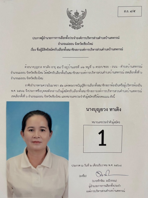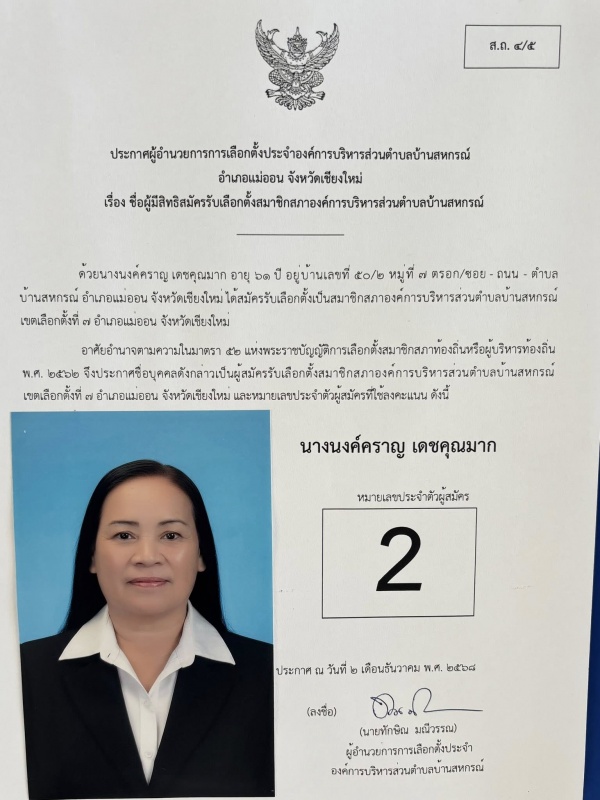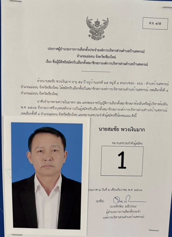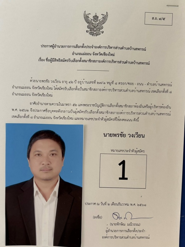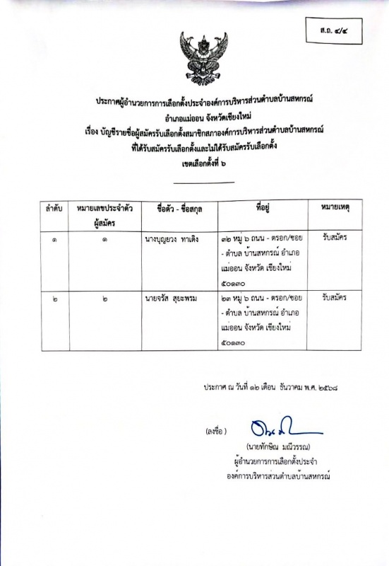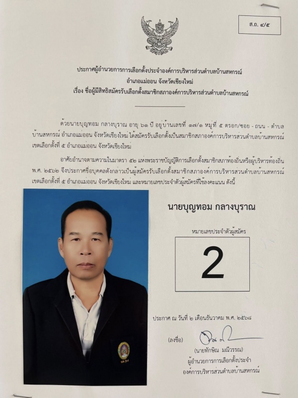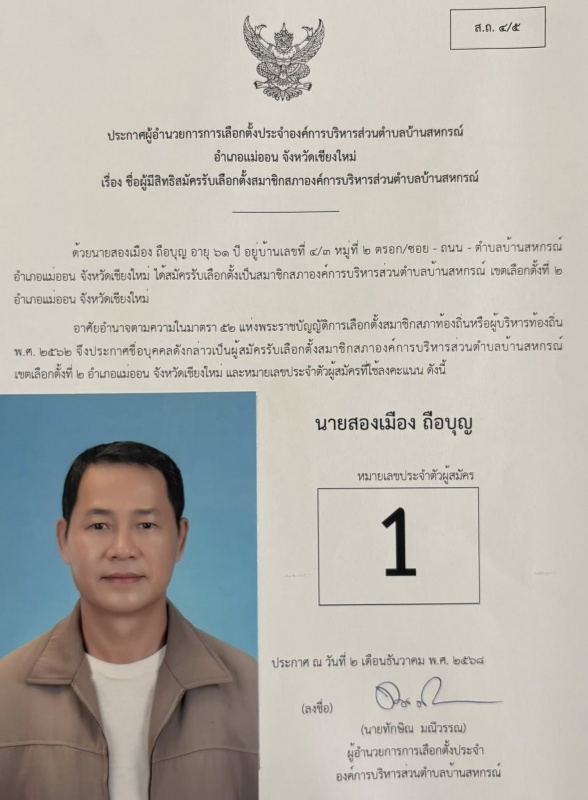 ประกาศผู้อำนวยการการเลือกตั้งประจำองค์การบริหารส่วนตำบลบ้านสหกรณ์ อำเภอแม่ออน จังหวัดเชียงใหม่ 2568