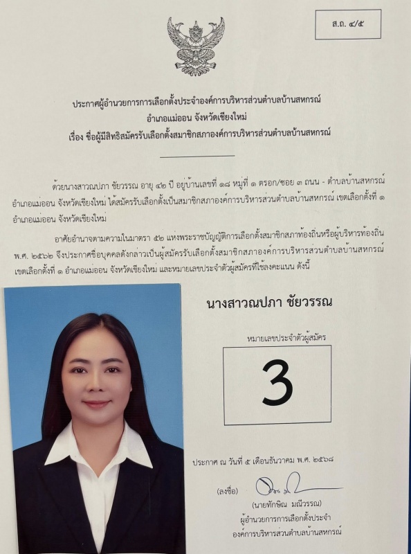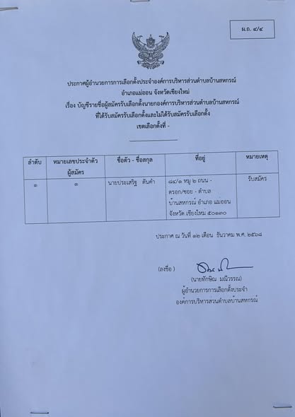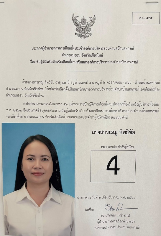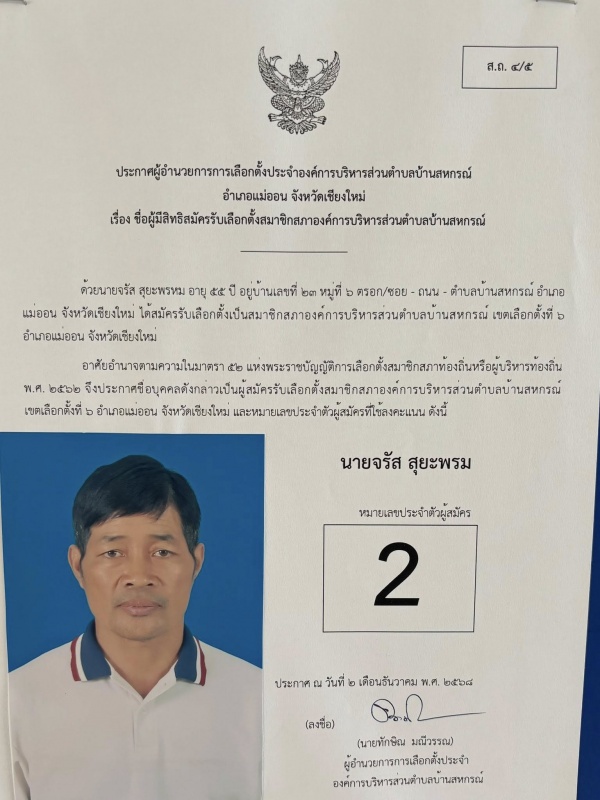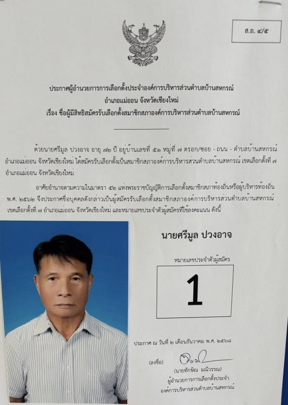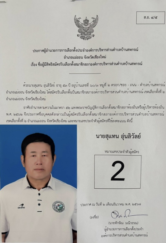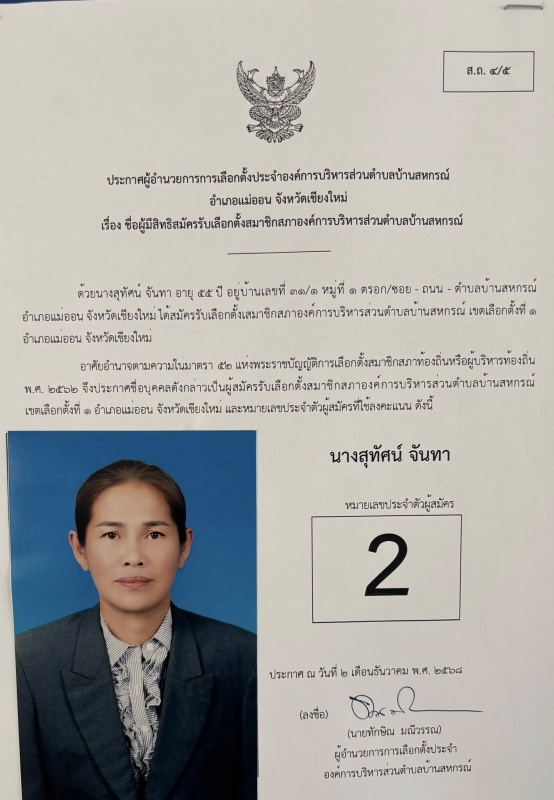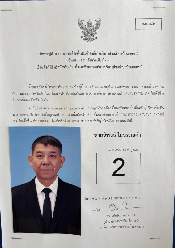 ประกาศผู้อำนวยการการเลือกตั้งประจำองค์การบริหารส่วนตำบลบ้านสหกรณ์ อำเภอแม่ออน จังหวัดเชียงใหม่ 2568