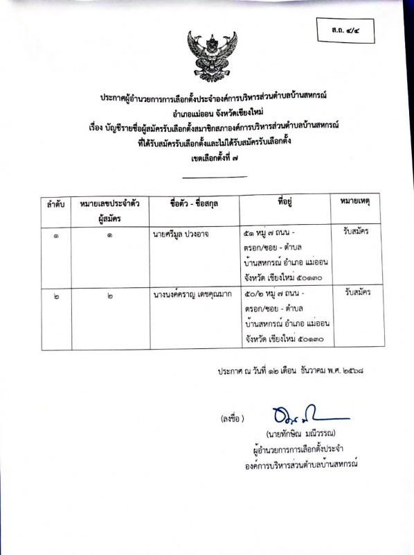 ประกาศผู้อำนวยการการเลือกตั้งประจำองค์การบริหารส่วนตำบลบ้านสหกรณ์ อำเภอแม่ออน จังหวัดเชียงใหม่