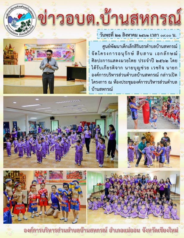 วันพุธที่ 21 สิงหาคม 2562 เวลา 09.00 น. ศูนย์พัฒนาเด็กเล็กสิรินธรตำบลบ้านสหกรณ์ จัดโครงการอนุรักษ์ สืบสาน เอกลักษณ์ ศิลปะการแสดงมวยไทย ประจำปี 2562 โดยได้รับเกียรติจาก นายบุญช่วย เวชกิจ นายกองค์การบริหารส่วนตำบลบ้านสหกรณ์ กล่าวเปิดโครงการ ณ ห้องประชุมองค์การบริหารส่วนตำบลบ้านสหกรณ์