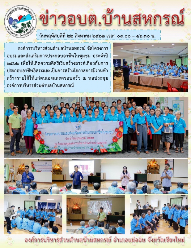 วันพฤหัสบดีที่ 22 สิงหาคม 2562 เวลา 09.00 - 16.30 น. องค์การบริหารส่วนตำบลบ้านสหกรณ์ จัดโครงการอบรมและส่งเสริมการประกอบอาชีพในชุมชน ประจำปี 2562 ได้รับเกียรติจาก นายวินัย ไชยวิลาส รองนายกองค์การบริหารส่วนตำบลบ้านสหกรณ์ และ นายภูรินท์ อุ่นบุญตัน ครู กศน.ตำบลบ้านสหกรณ์ ทำหน้าที่เป็นวิทยากรในครั้งนี้ เพื่อให้เกิดความคิดริเริ่มสร้างสรรค์เกี่ยวกับการประกอบอาชีพอิสระและเป็นการสร้างโอกาสการมีงานทำสร้างรายได้ให้แก่ตนเองและครอบครัว ณ หอประชุมองค์การบริหารส่วนตำบลบ้านสหกรณ์