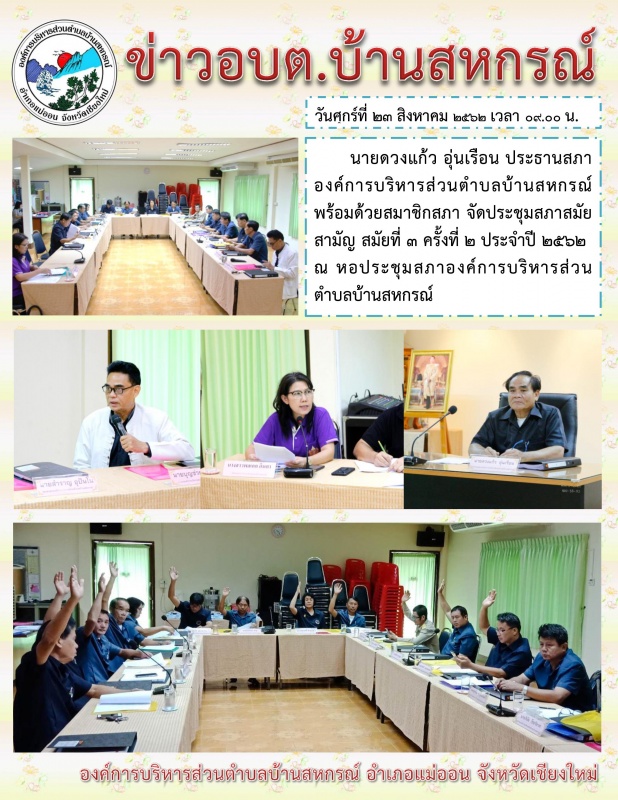 วันศุกร์ที่ 23 สิงหาคม 2562 เวลา 09.00 น. นายดวงแก้ว อุ่นเรือน ประธานสภาองค์การบริหารส่วนตำบลบ้านสหกรณ์ พร้อมด้วยสมาชิกสภา และผู้บริหารองค์การบริหารส่วนตำบลบ้านสหกรณ์ จัดประชุมสภาสมัยสามัญ สมัยที่ 3 ครั้งที่ 2 ประจำปี 2562 ณ หอประชุมสภาองค์การบริหารส่วนตำบลบ้านสหกรณ์