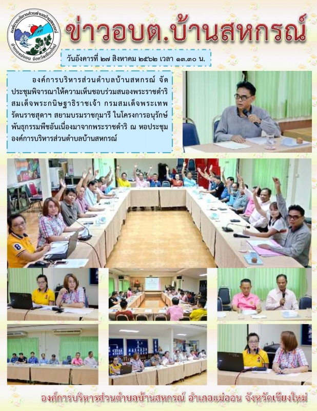 วันอังคารที่ 27 สิงหาคม 2562 เวลา 13.30 น. องค์การบริหารส่วนตำบลบ้านสหกรณ์ จัดประชุมพิจารณาให้ความเห็นชอบร่วมสนองพระราชดำริ สมเด็จพระกนิษฐาธิราชเจ้า กรมสมเด็จพระเทพรัตนราชสุดาฯ สยามบรมราชกุมารี ในโครงการอนุรักษ์พันธุกรรมพืชอันเนื่องมาจากพระราชดำริ สมเด็จพระกนิษฐาธิราชเจ้า กรมสมเด็จพระเทพรัตนราชสุดาฯ ณ ห้องประชุมองค์การบริหารส่วนตำบลบ้านสหกรณ์