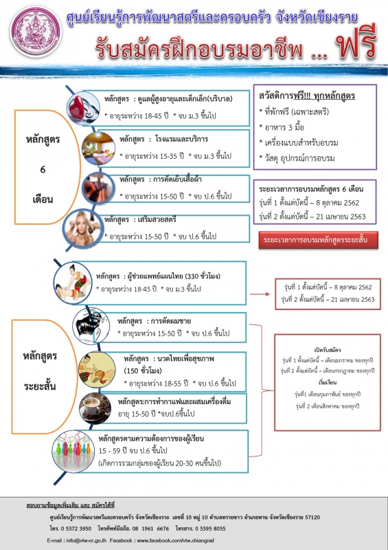 ศูนย์เรียนรู้การพัฒนาสตรีและครอบครัว จ.เชียงราย เปิดรับสมัครรอบวิชาชีพให้กับสตรี เยาวสตรี และเยาวชน ที่ครอบครัวฐานะยากจน และขาดโอกาสทางการศึกษา ในเขต 17 จังหวัดภาคเหนือ หลักสูตร 6 เดือน และระยะสั้น รุ่นที่ 49 ฝึกอบรมอาชีพ ไม่ต้องเสียค่าใช้จ่ายใดๆทั้งสิ้น เปิดรับถึงวันที่ 8 ตุลาคม 2562