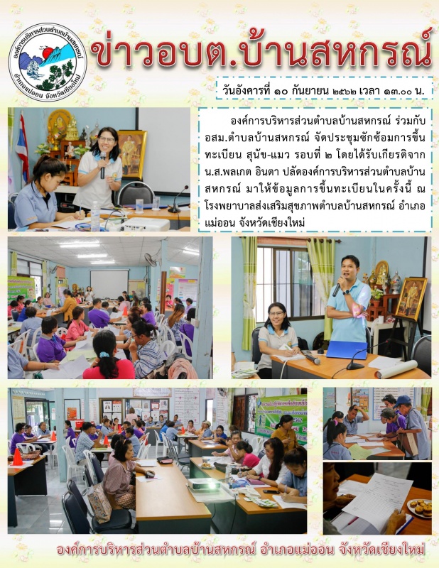 วันอังคารที่ 10 กันยายน 2562 องค์การบริหารส่วนตำบลบ้านสหกรณ์ร่วมกับอสม.ตำบลบ้านสหกรณ์ จัดประชุมซักซ้อมการขึ้นทะเบียน สุนัข-แมว รอบที่ 2 โดยได้รับเกียรติจาก น.ส.พลเกต อินตา ปลัดองค์การบริหารส่วนตำบลบ้านสหกรณ์ มาให้ข้อมูลการขึ้นทะเบียนในครั้งนี้ ณ โรงพยาบาลส่งเสริมสุขภาพตำบลบ้านสหกรณ์ อำเภอแม่ออน จังหวัดเชียงใหม่