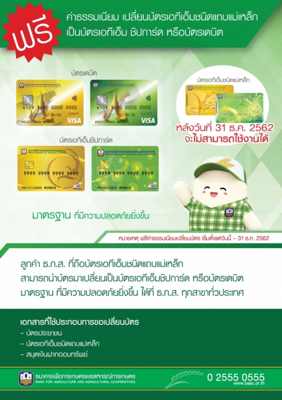 ประชาสัมพันธ์จากธนาคารธกส.สาขาแม่ออน เรื่องเปลี่ยนบัตร ATM แถบแม่เหล็ก เป็นแบบชิปการ์ด หรือบัตรเดบิต #ฟรีค่าธรรมเนียม ถึงสิ้นปี 2562 นี้เท่านั้น (ต้องไม่ติดค้างค่าธรรมเนียมรายปีและบัตรสามารถใช้งานได้ปกติ)