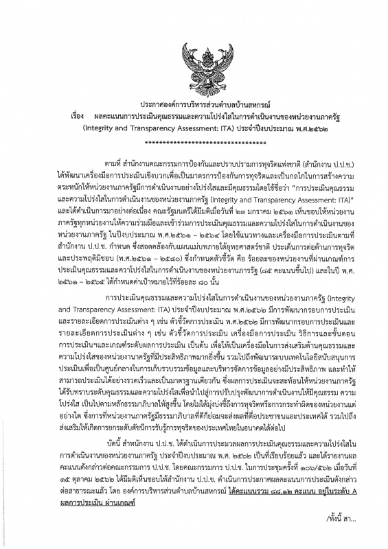 ผลคะแนนการประเมินและความโปร่งใสในการดำเนินงานของหน่วยงานภาครัฐ (ITA.) ประจำปีงบประมาณ 2562