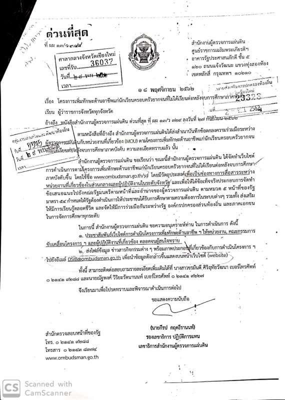 ประชาสัมพันธ์จากองค์การบริหารส่วนตำบลบ้านสหกรณ์ สำนักงานส่งเสริมการปกครองท้องถิ่นอำเภอแม่ออน ได้ฝากประชาสัมพันธ์เว็บไซต์ www.ombudsman.go.th/sd ตามโครงการเพิ่มทักษะด้านอาชีพแก่นักเรียนครอบครัวยากจนที่ไม่ได้เรียนต่อหลังจบการศึกษาภาคบังคับ เพื่อเป็นช่องทางการสื่อสารระหว่างหน่วยงานที่เกี่ยวข้องในส่วนกลางและผู้ปฏิบัติงานในระดับจังหวัด