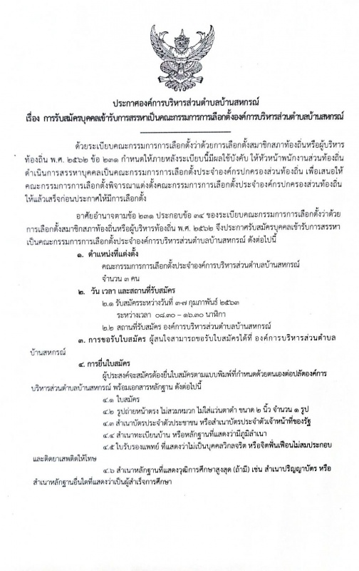 รับสมัครบุคคลเข้ารับการสรรหาเป็นคณะกรรมการการเลือกตั้งประจำองค์การบริหารส่วนตำบลบ้านสหกรณ์